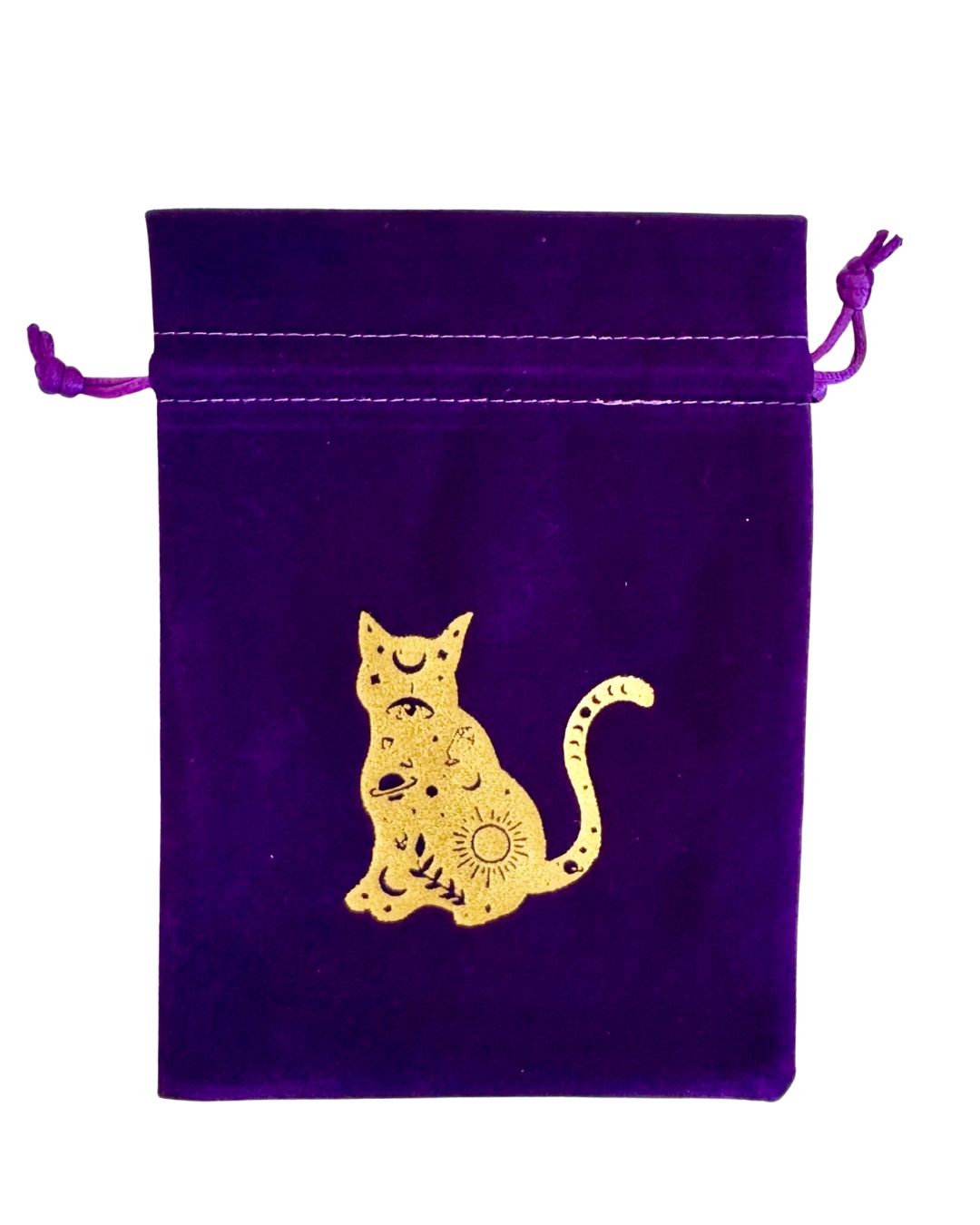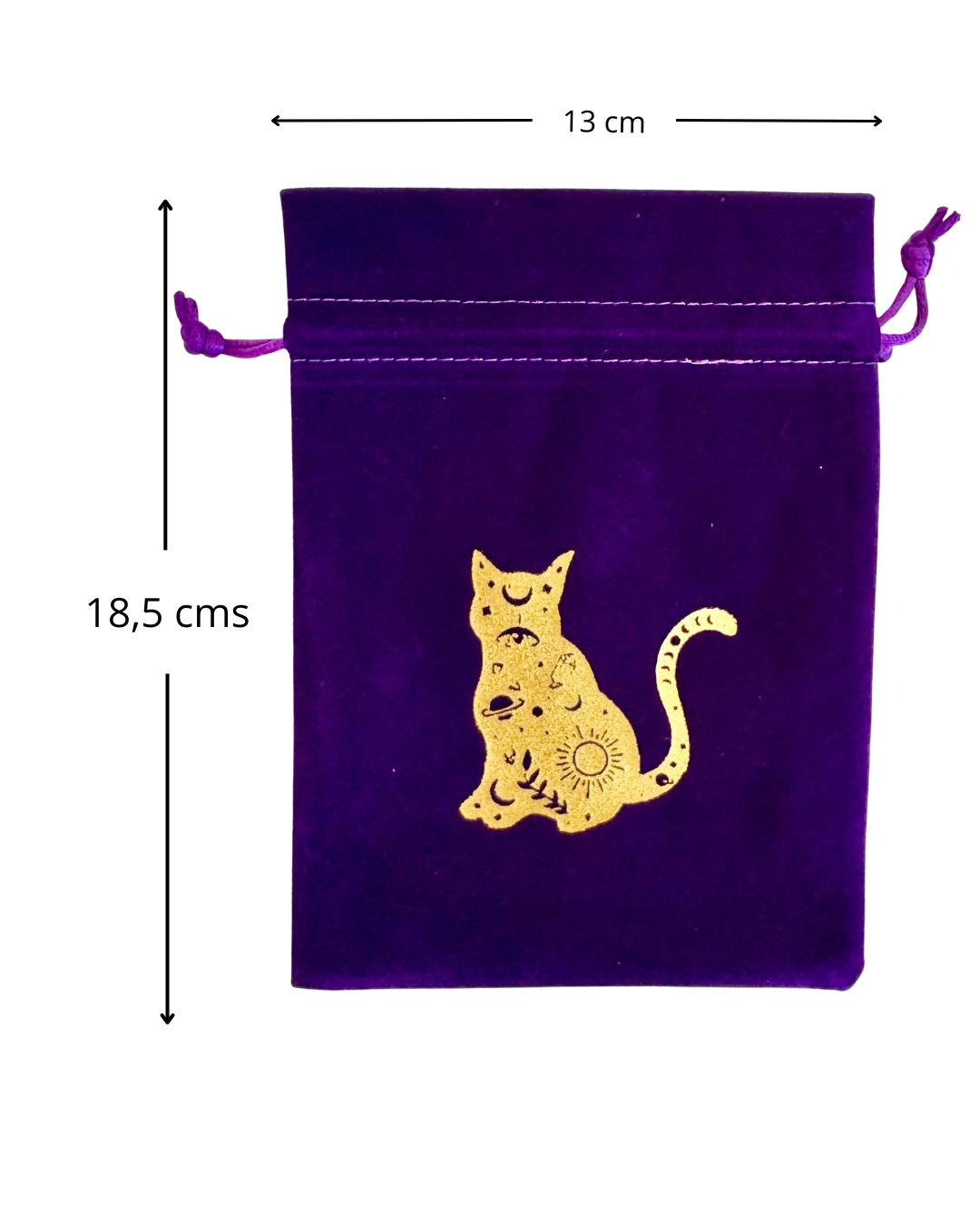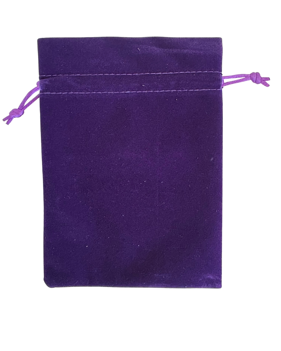 Esta bolsa de terciopelo es un espacio seguro para resguardar objetos energéticos y personales. Su textura suave y su color morado —asociado a la intuición y la espiritualidad— ayudan a mantener la vibración de tus herramientas limpia, protegida y contenida.