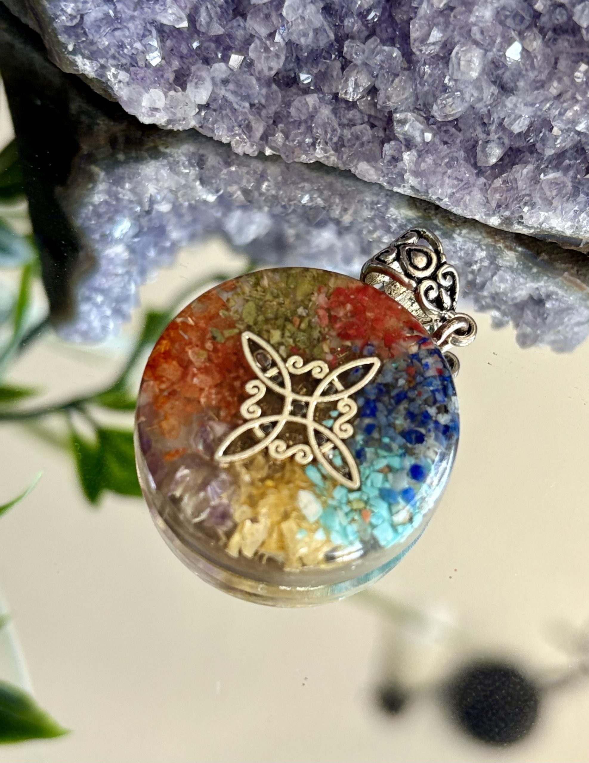 Colgante de orgonita diseñado para acompañarte diariamente equilibrando tu campo energético. Su combinación de resina, metales y cristales asociados a los siete chakras ayuda a transformar la energía densa en energía vital, promoviendo bienestar integral mientras la llevas contigo.